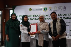 Kegiatan ini diakhiri dengan penyerahan sertifikasi halal kepada peserta oleh Indah Ruqoyah K., S.AP dari Kementerian Agama Kanwil Kabupaten Tangerang,