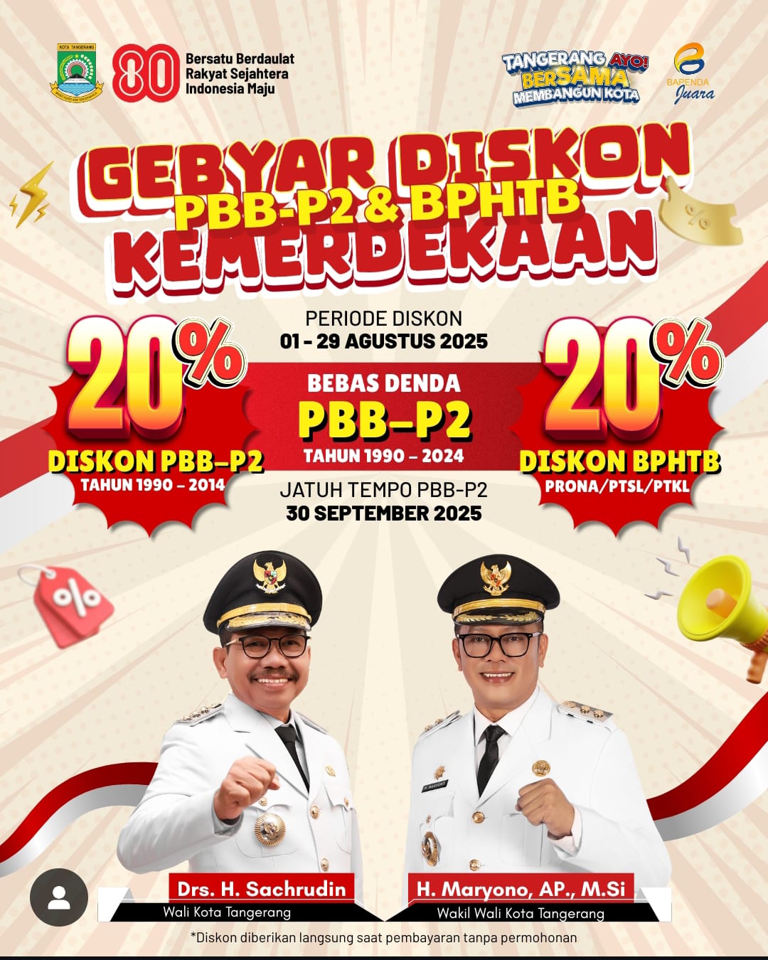 Program yang digagas oleh Wali Kota Tangerang, Drs. H. Sachrudin, dan Wakil Wali Kota, H. Maryono, AP., M.Si ini bertujuan untuk meringankan beban masyarakat sekaligus meningkatkan kesadaran dalam membayar pajak untuk pembangunan kota. Program ini berlaku sepanjang bulan kemerdekaan, mulai tanggal 01 hingga 29 Agustus 2025.